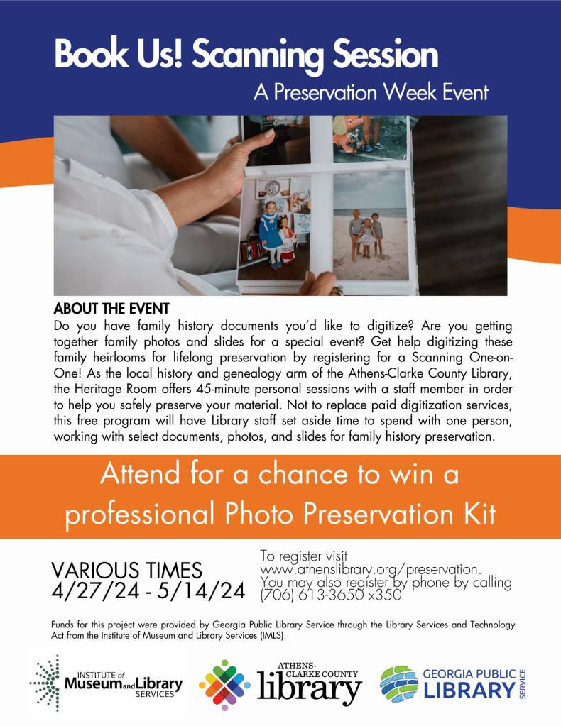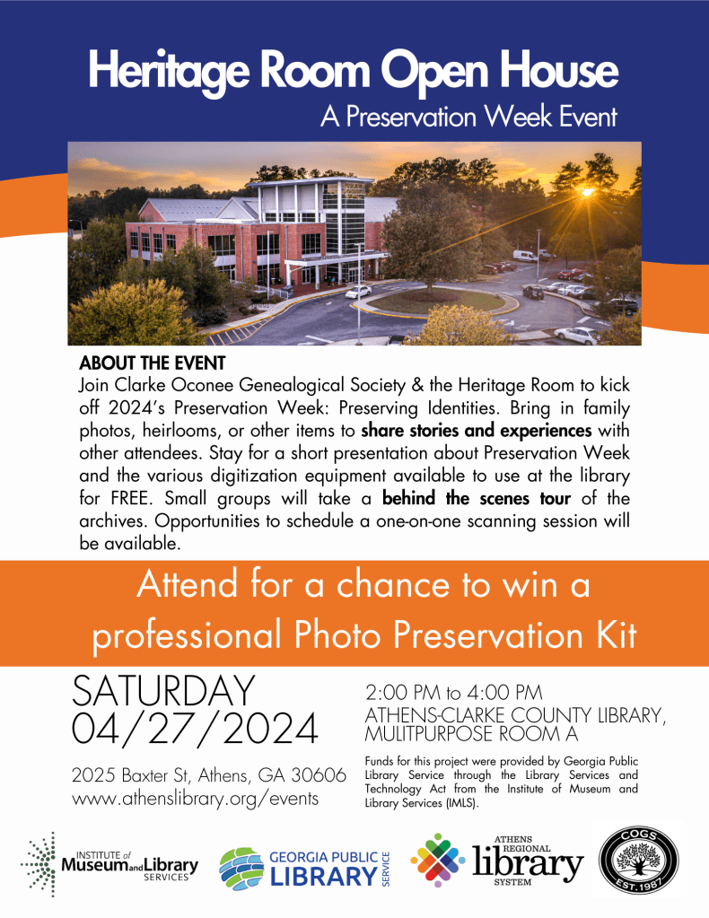 Join Clarke-Oconee Genealogical Society & the Athens-Clarke County Library Heritage Room to kick off 2024’s Preservation Week: Preserving Identities. Bring in family photos, heirlooms, or other items to share stories and experiences with other attendees. A short presentation about Preservation Week activities and the various digitization equipment available to use at the library for FREE will take place. Then small groups will be able take a behind the scenes tour of the archives at the Athens-Clarke County Library. Attendees will also be able to schedule a one-on-one scanning session with Heritage Room staff throughout the day.