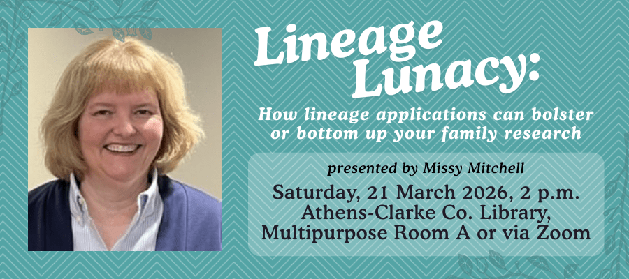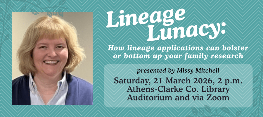 Missy Mitchell is a long time genealogist, a registrar for the Daughters of the American Revolution (DAR), and serves on several “hard problem” DAR research committees. She is also a proud member of First Families of Gwinnett.