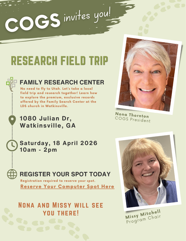 Not a member? Simply follow this link https://cogsgenealogy.org/join/ to join COGS and then register to reserve your seat. We would love to have you join us!
