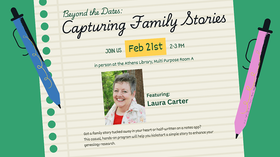Saturday, 21 February 2026, 2 p.m.Athens-Clarke Co. Library, Multipurpose Room AFree and open to the public An in-person, skill building program featuring a slideshow, helpful handout, and easy, hands-on writing practice led by Laura Williams Carter. All levels of experience welcome. Stories! This is what our genealogy needs. They are such an important part ofContinue reading “Beyond the Dates: Capturing Family Stories”