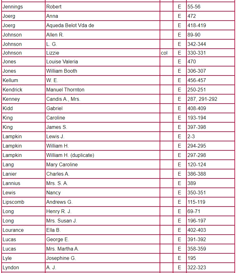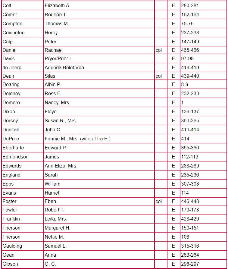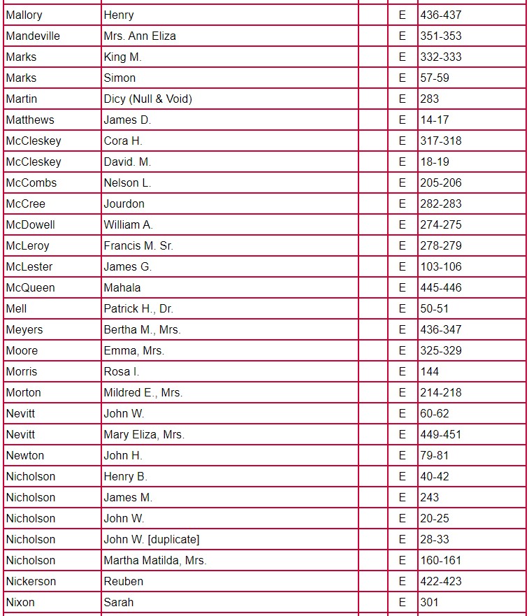 The following chart for Clarke County Will Book E gives the name of the testator, will book, and page number on which the will is located.