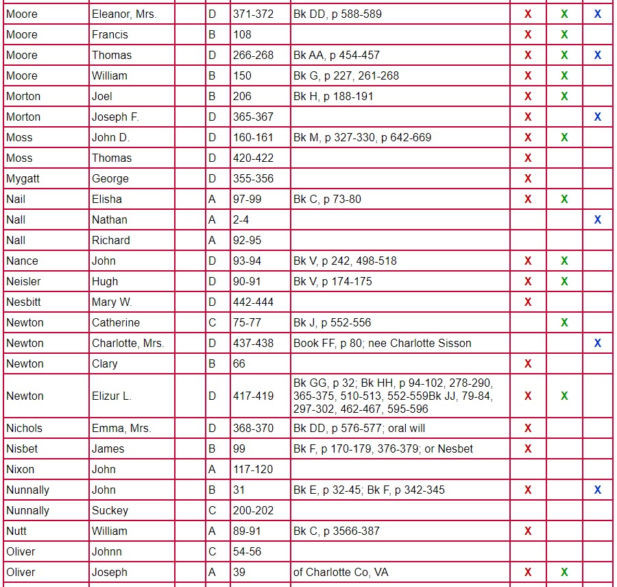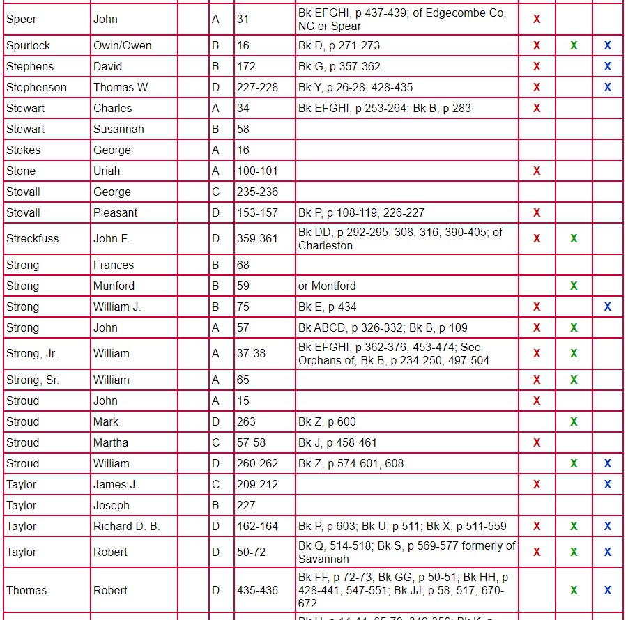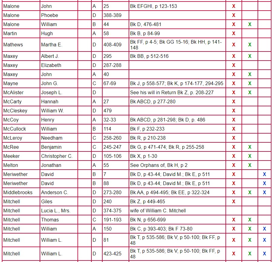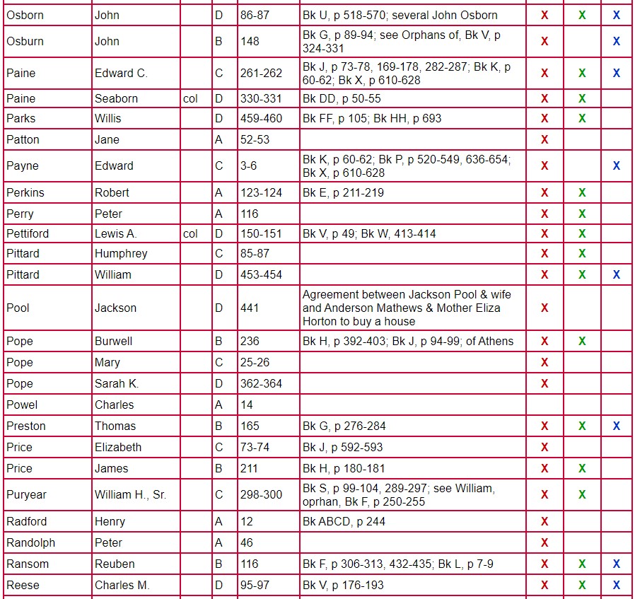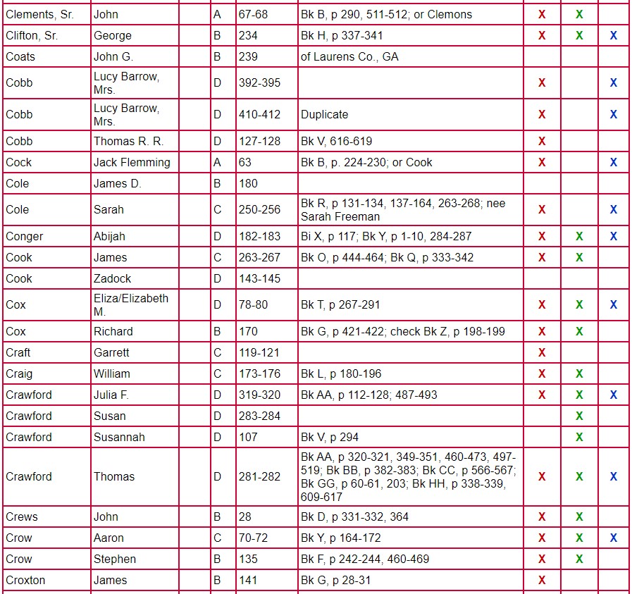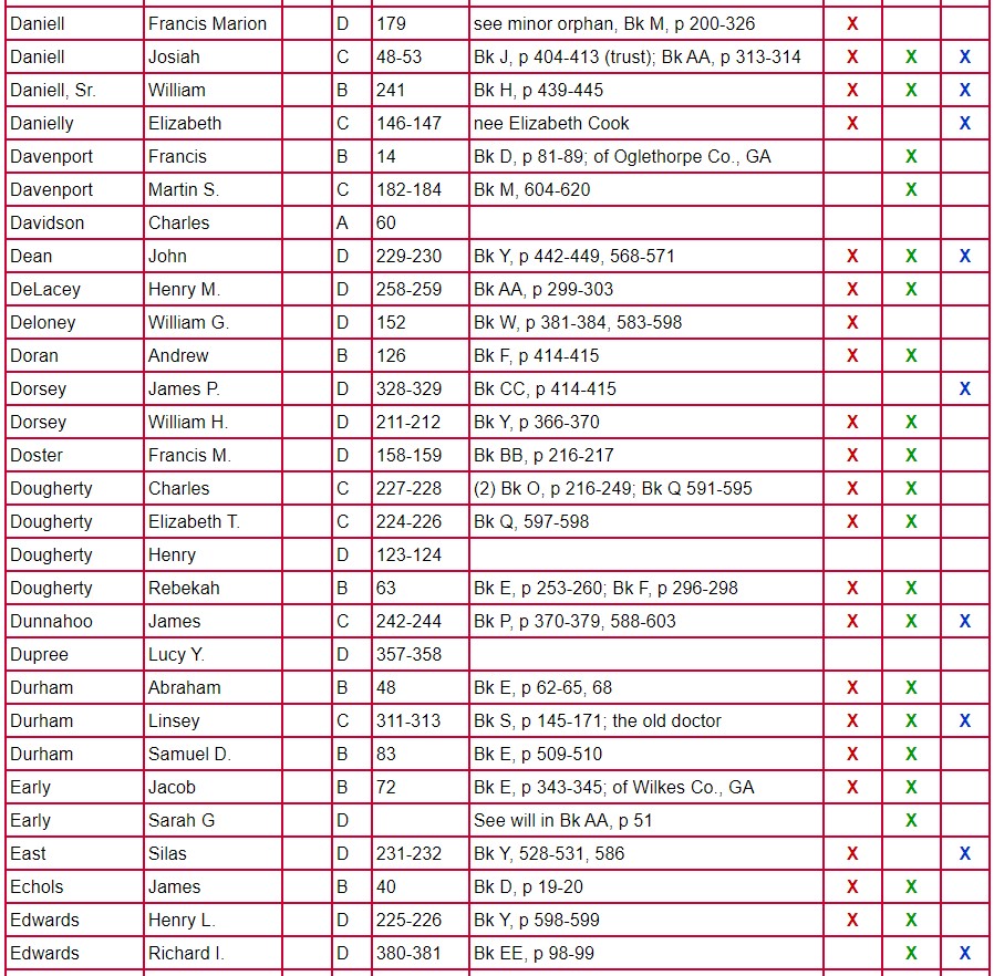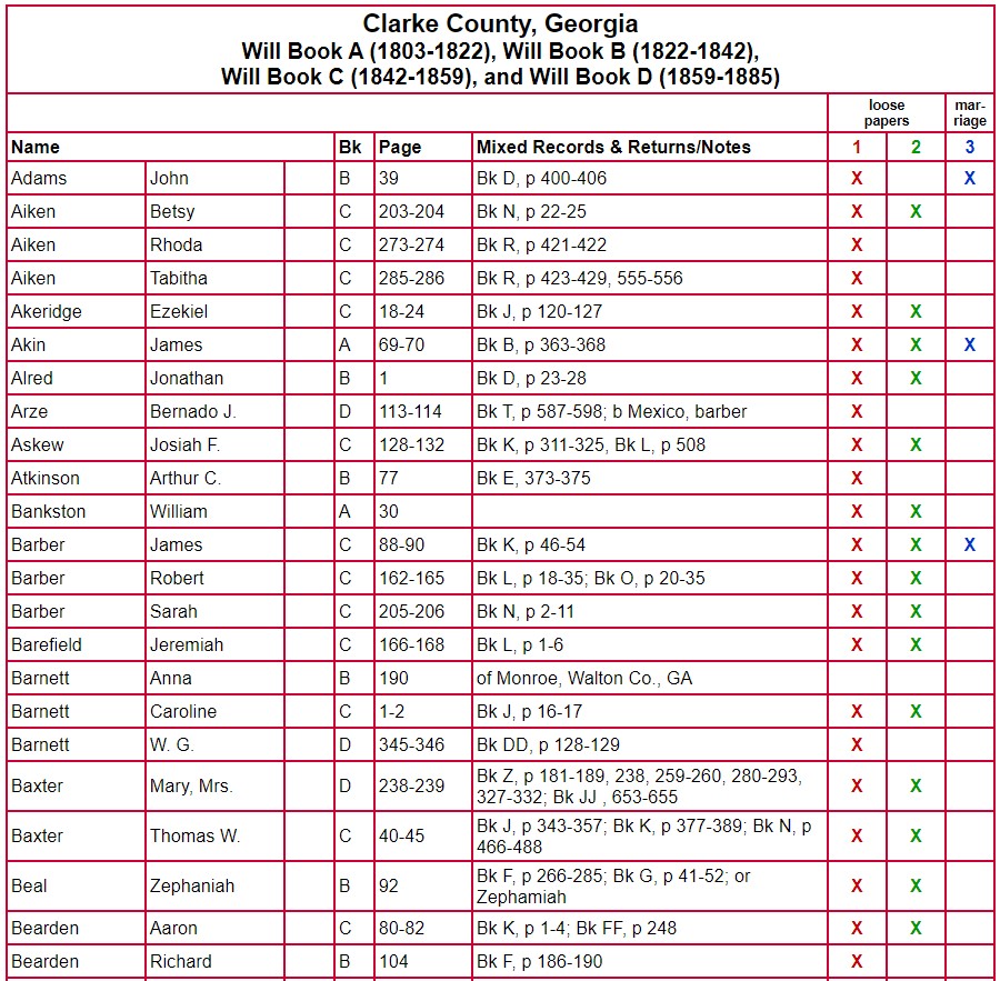 The following chart for Clarke County Will Books A, B, C, and D gives the name of the testator, will book, and page number on which the will is located. The column labeled Mixed Records & Returns/Notes indicates the locations of the administration, inventory, appraisal, and sale of the estate. The amount of information contained there varies from estate to estate. Columns 1 and 2 indicate if there are loose papers. When court proceedings took place, bills, vouchers, receipts, affidavits, etc were filed; some of these papers have survived. Unlike the record in books, these loose records contain the handwriting and signature of the person-not that of the clerk. Column 3 indicates that there is a marriage listed for that person. A separate page houses the index for Will Book E.