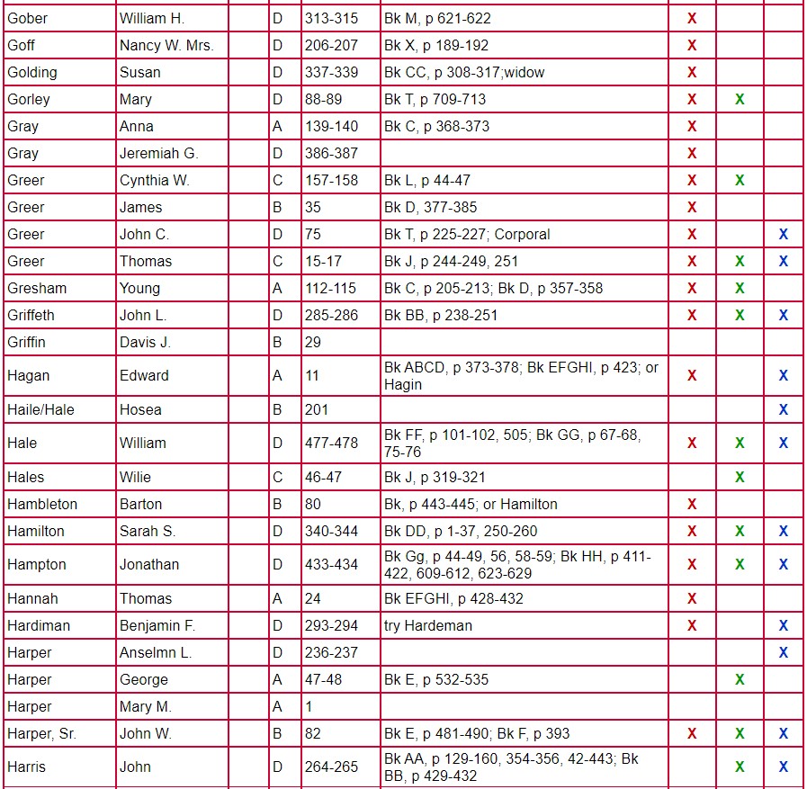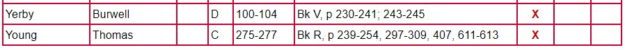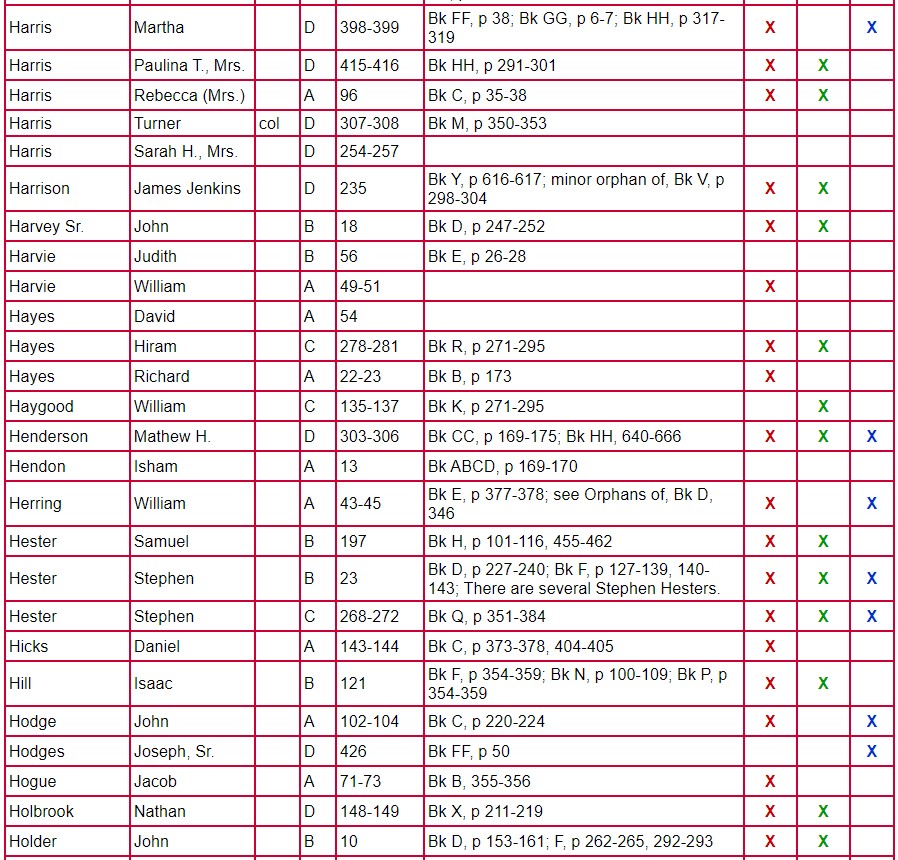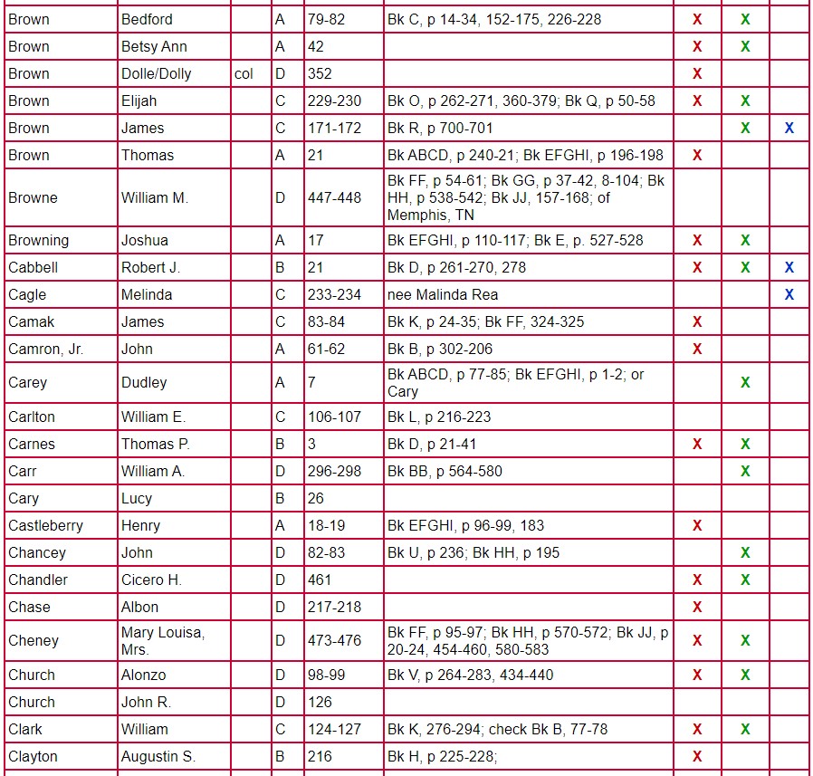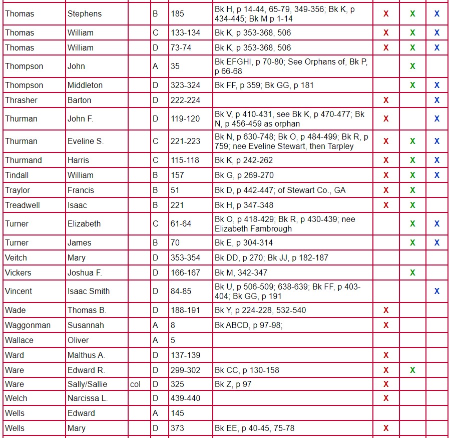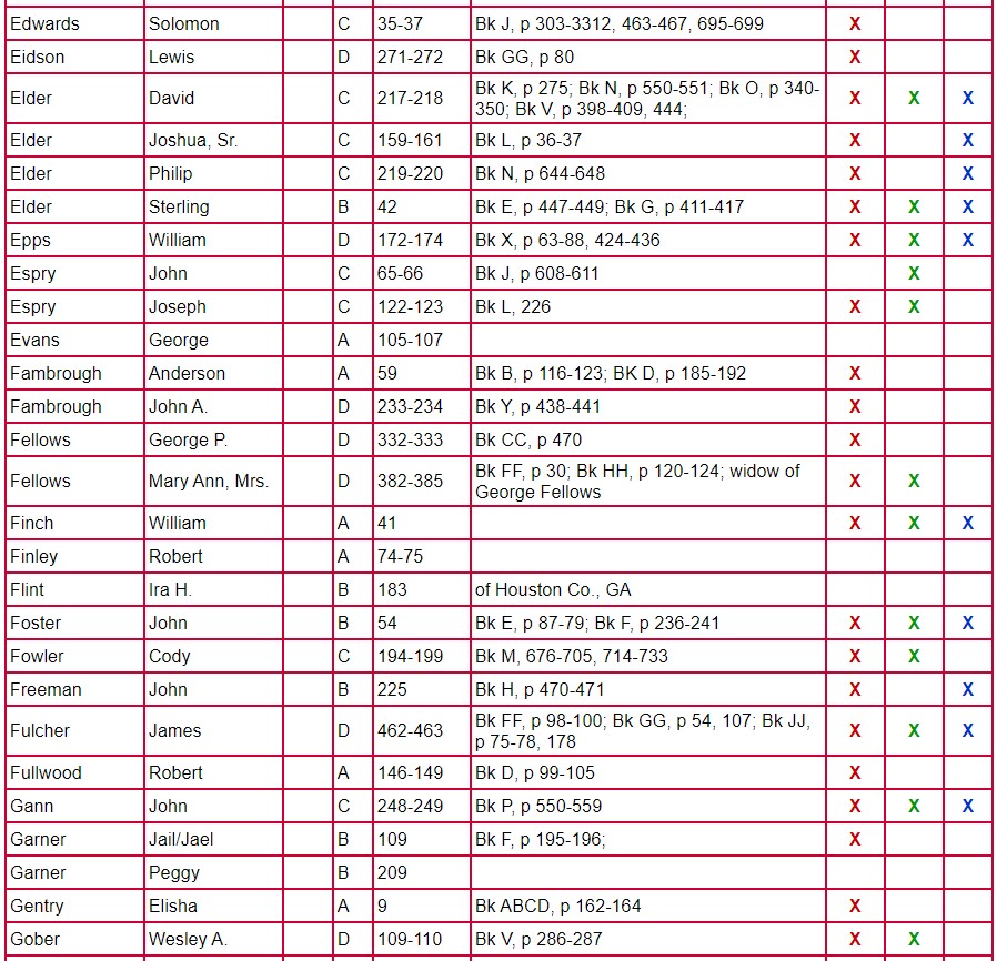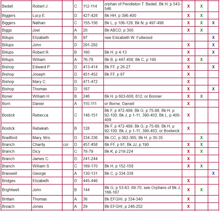 The following chart for Clarke County Will Books A, B, C, and D gives the name of the testator, will book, and page number on which the will is located. The column labeled Mixed Records & Returns/Notes indicates the locations of the administration, inventory, appraisal, and sale of the estate. The amount of information contained there varies from estate to estate. Columns 1 and 2 indicate if there are loose papers. When court proceedings took place, bills, vouchers, receipts, affidavits, etc were filed; some of these papers have survived. Unlike the record in books, these loose records contain the handwriting and signature of the person-not that of the clerk. Column 3 indicates that there is a marriage listed for that person. A separate page houses the index for Will Book E.