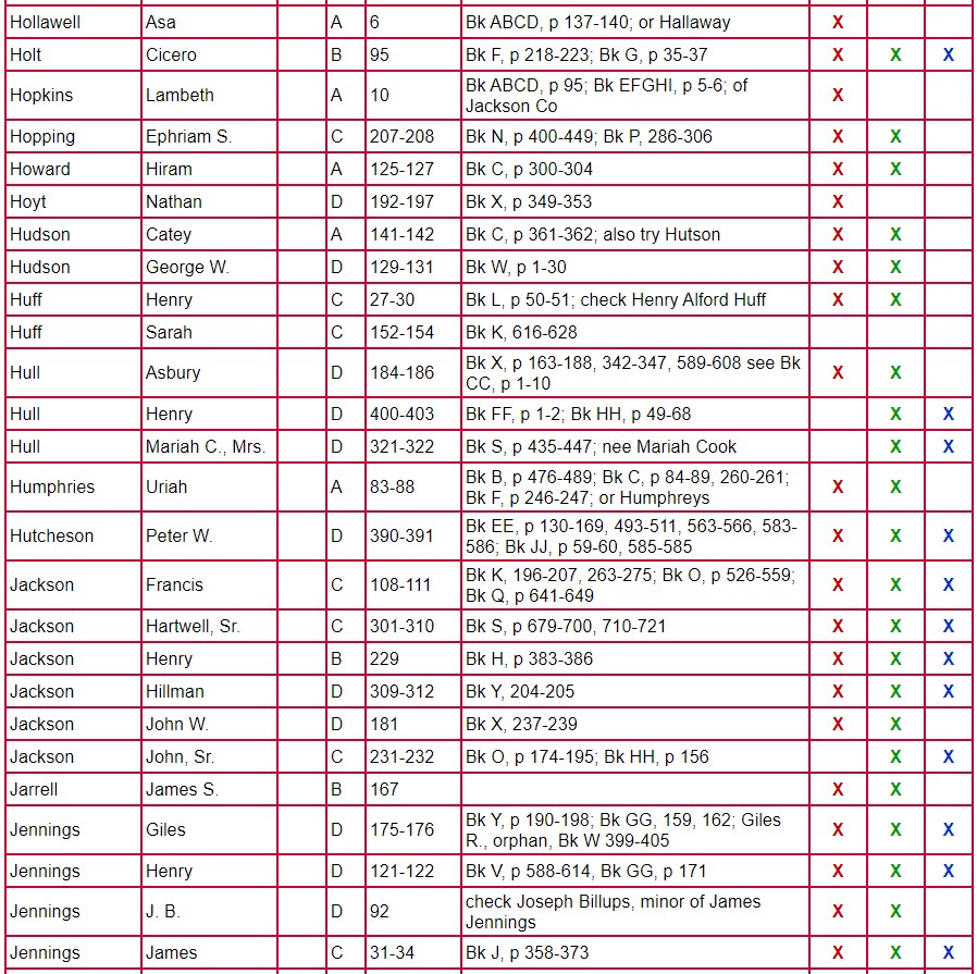 Both the books of returns & mixed records and the loose papers are in the records vault at the courthouse in Athens. This room is not open on a reliable schedule. Both the books and the loose papers in column 1 have been microfilmed and the microfilm is available at the Athens Regional Library Heritage Room and the Georgia State Archives; images are available online at FamilySearch.org.