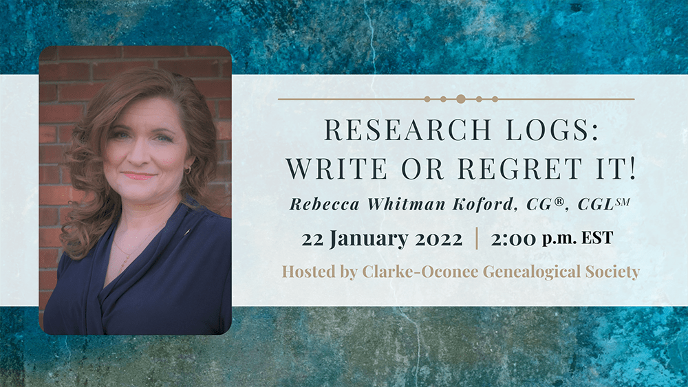 Saturday, 22 January 2022 at 2:00 p.m. EST via Zoom We are excited to begin the new year with the program Research Logs: Write or Regret It! presented by genealogical researcher, lecturer, and instructor Rebecca Whitman Koford, CG®, CGLSM. Why is this such an important topic? Organizing is key to understanding. If you can’t find it, how canContinue reading “Research Logs: Write or Regret It!”